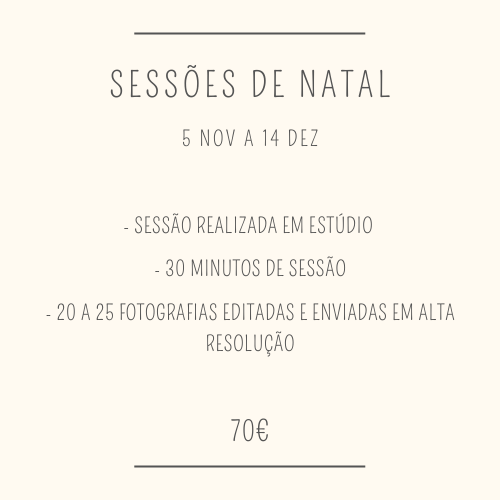 - O custo da Sessão de Natal é de 70€, sendo que, para efectuar a reserva da data será solicitado o pagamento de um sinal de 50%. O restante valor será liquidado no dia da sessão.