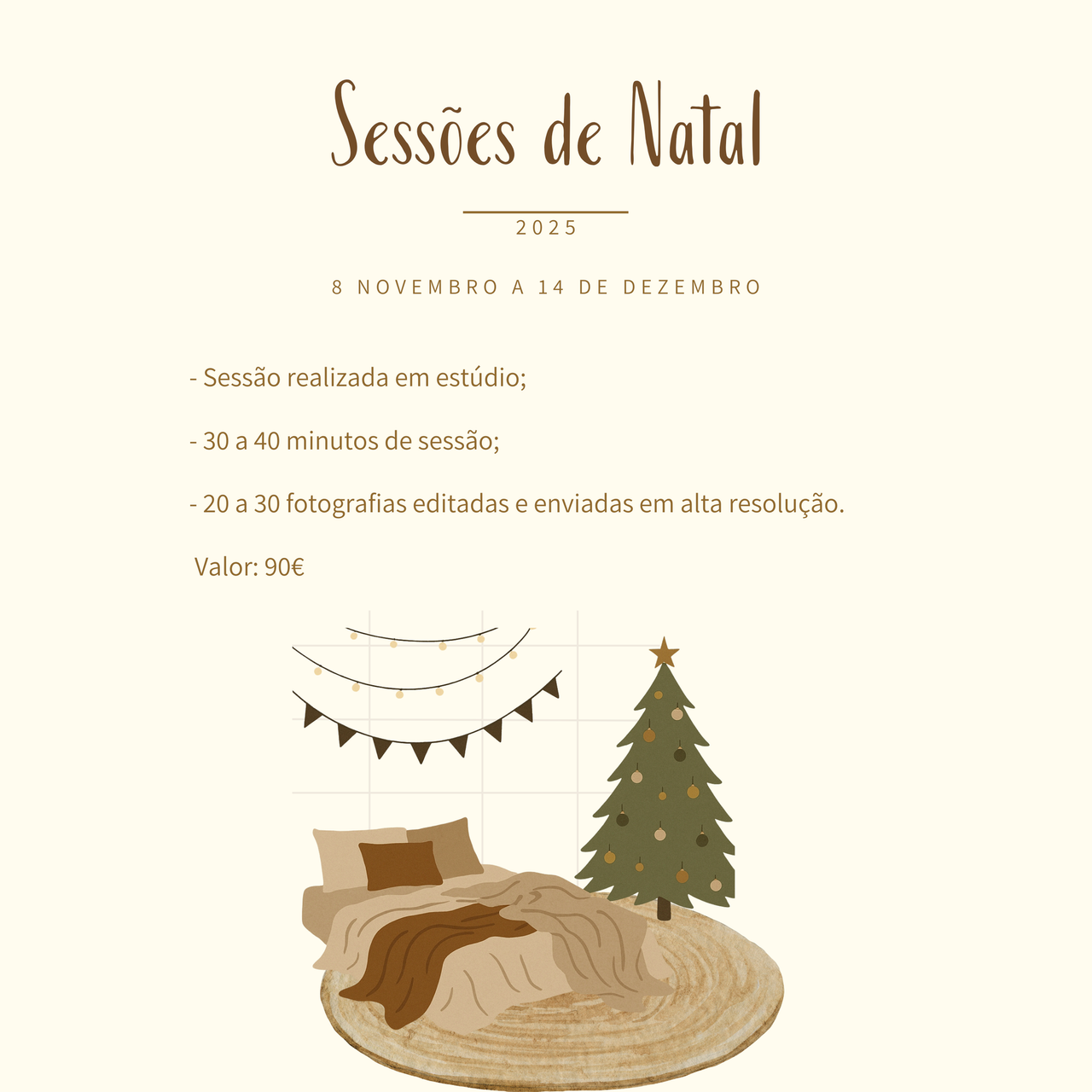 - O custo da Sessão de Natal é de 90€, sendo que, para efectuar a reserva da data, será solicitado o pagamento de um sinal de 50%. O restante valor será liquidado no dia da sessão.